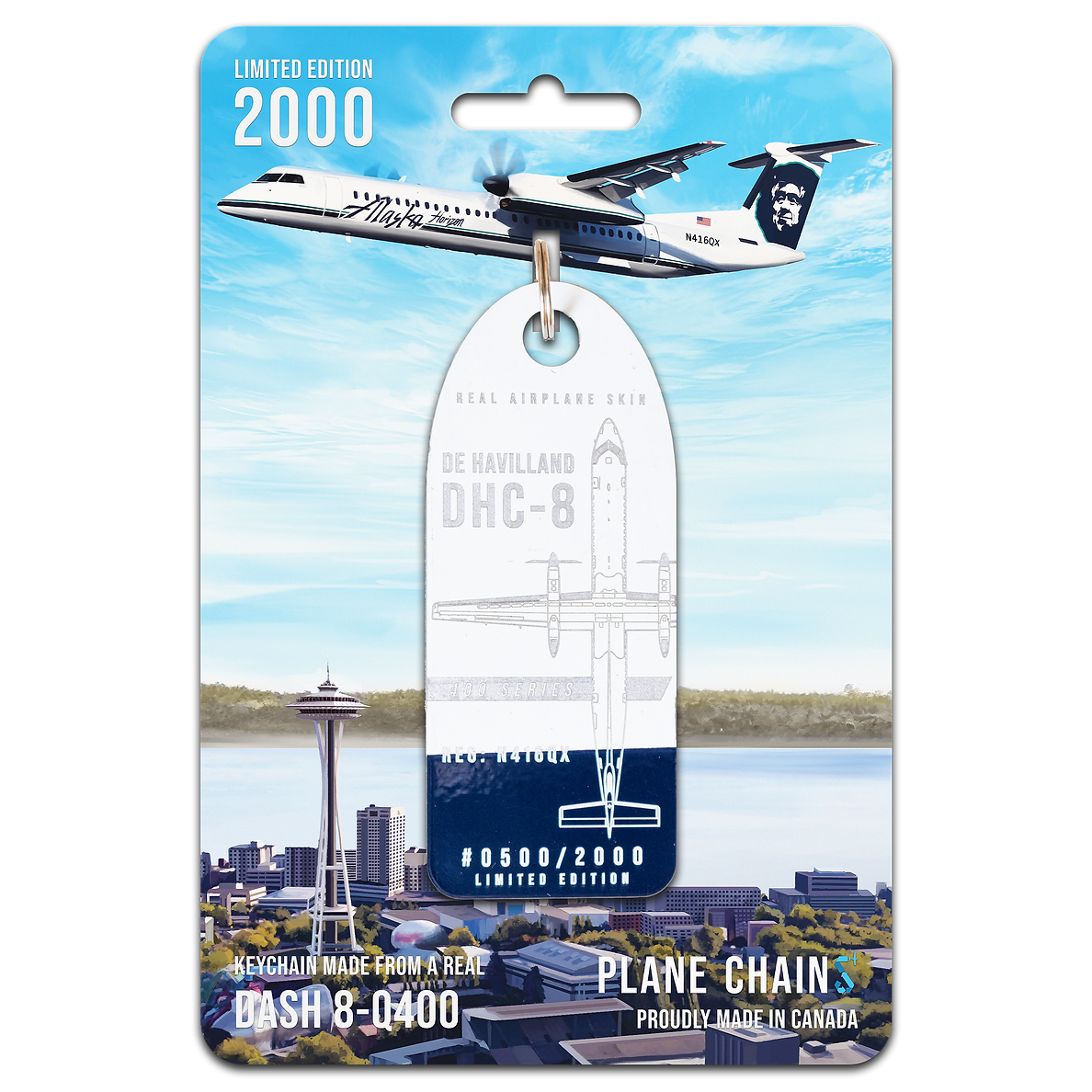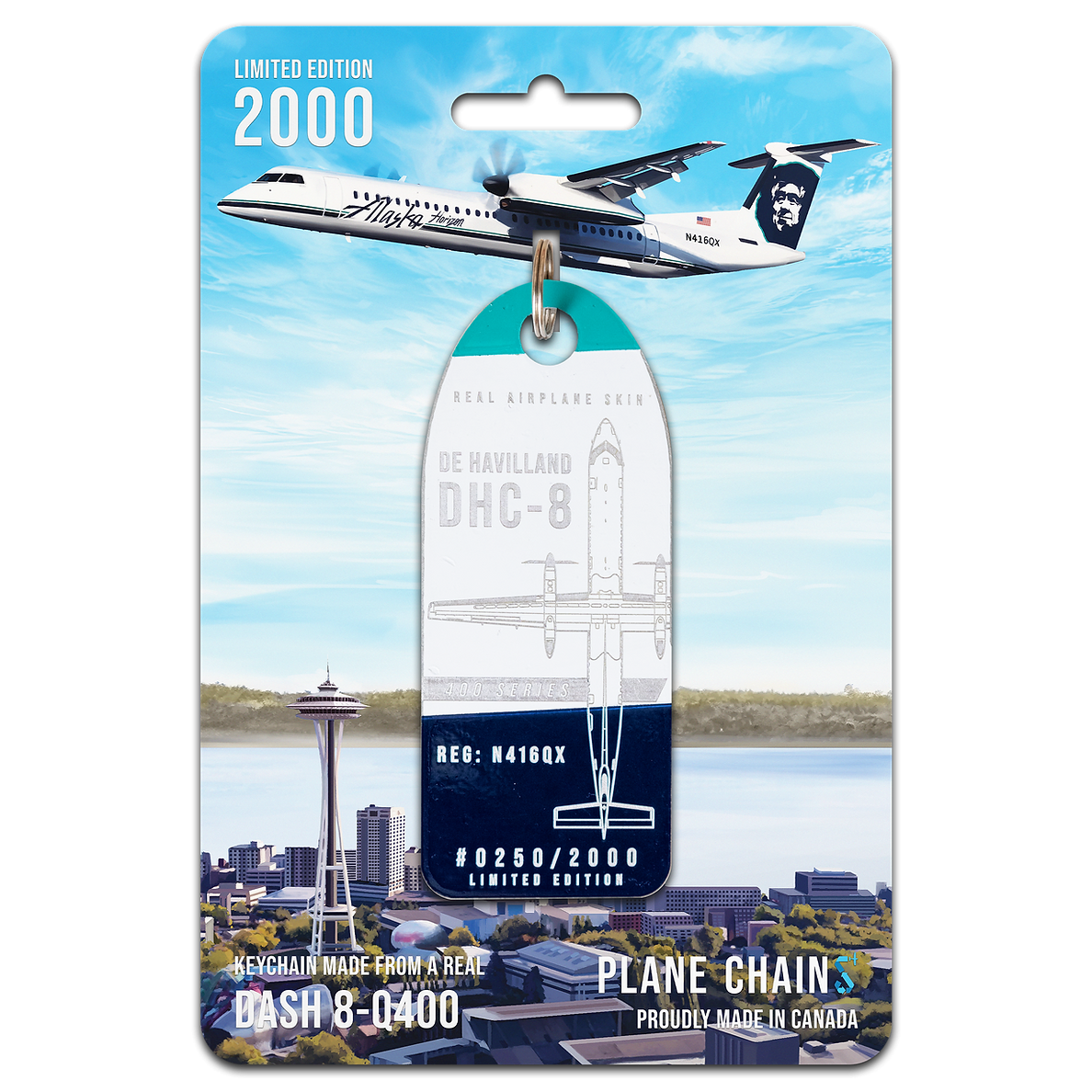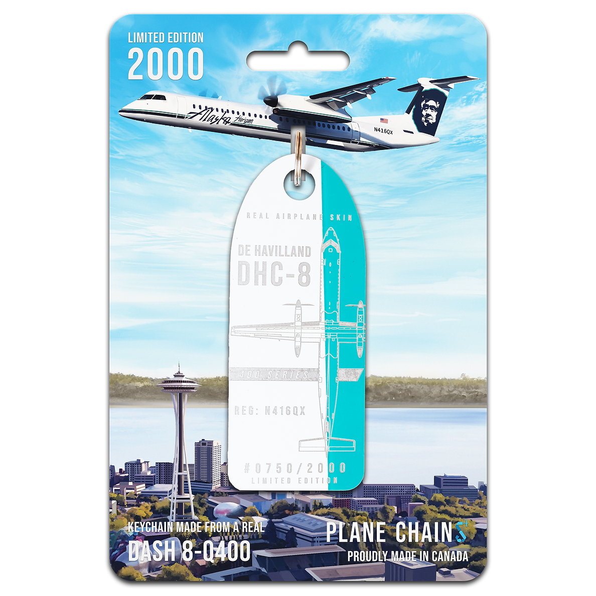 These incredible new Plane Chains are crafted from the fuselag and wing skin of an ex-Alaska Horizon Q400; N416QX. They feature all of the beautiful colours of the old Alaska Airlines Livery. Including white from the wings and fuslage, gray from the belly, and of course the iconic midnight blue and green from the cheatline down the fuselage.