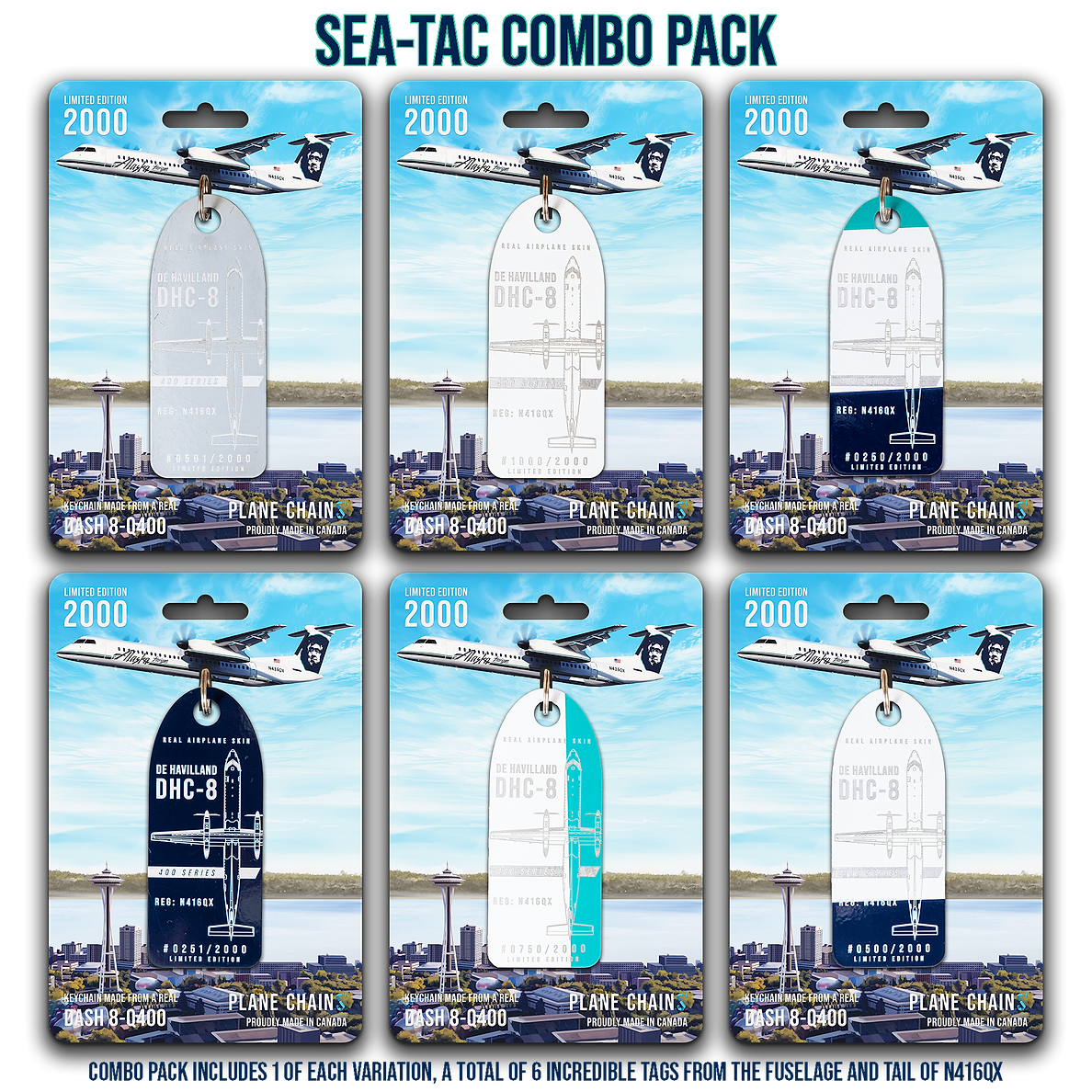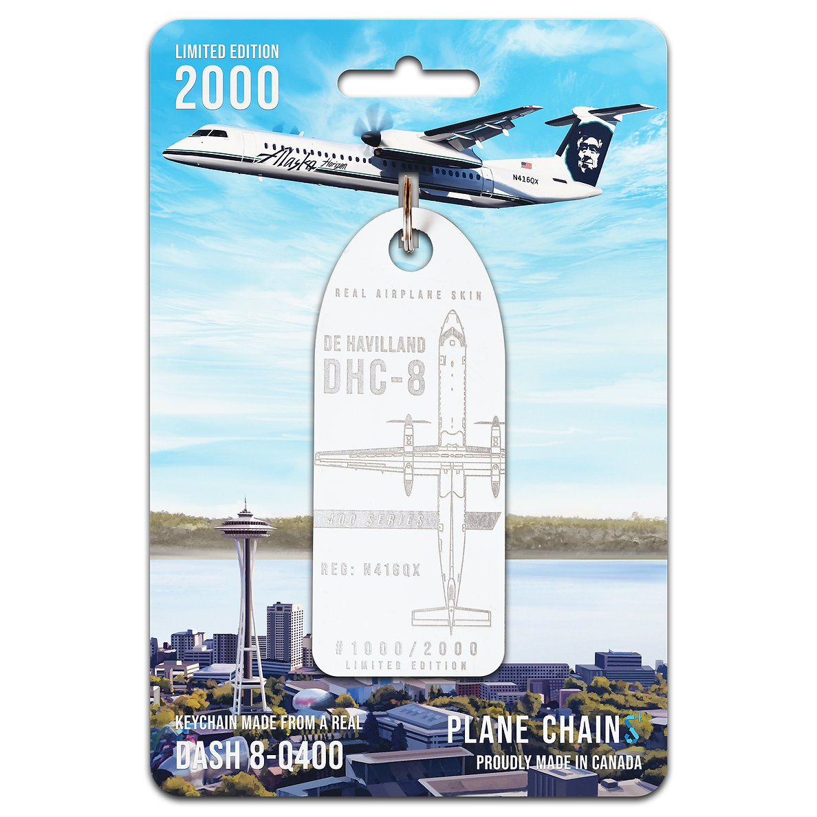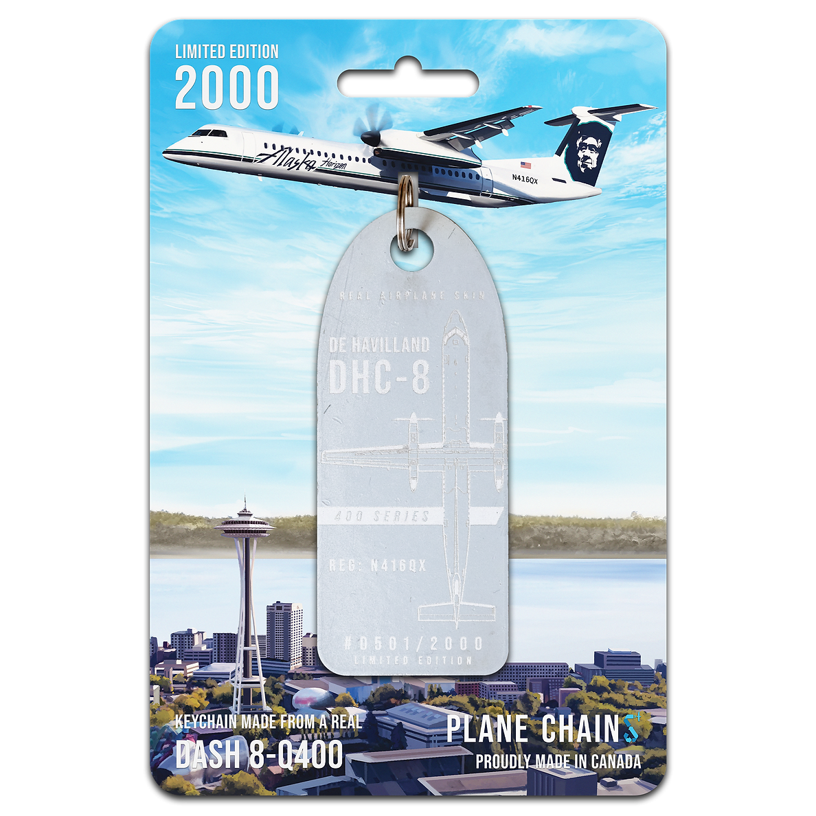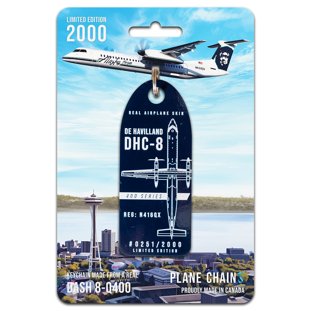 These incredible new Plane Chains are crafted from the fuselag and wing skin of an ex-Alaska Horizon Q400; N416QX. They feature all of the beautiful colours of the old Alaska Airlines Livery. Including white from the wings and fuslage, gray from the belly, and of course the iconic midnight blue and green from the cheatline down the fuselage.