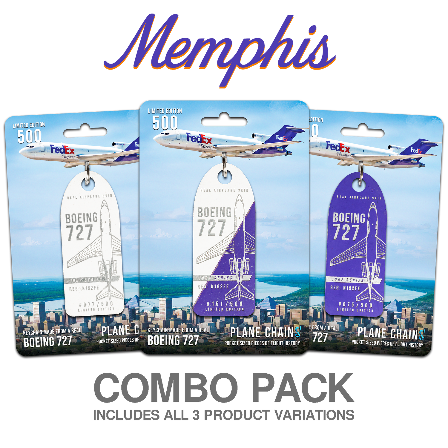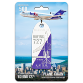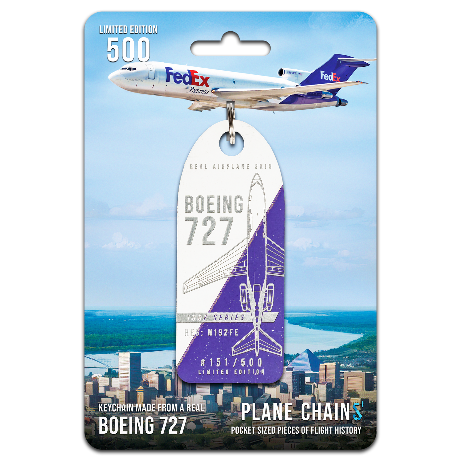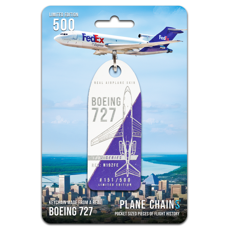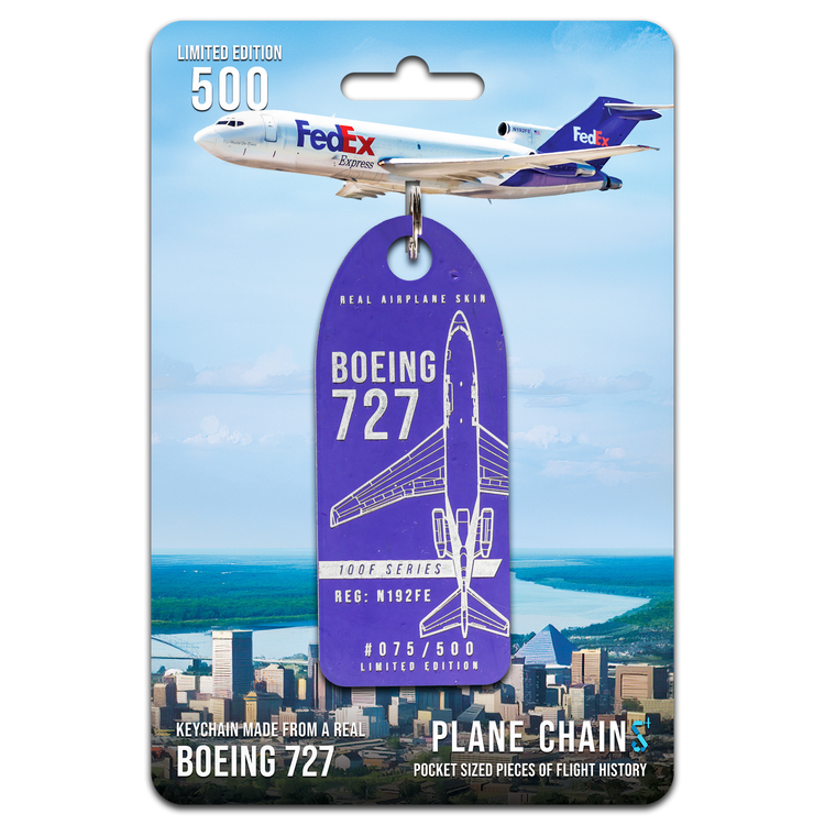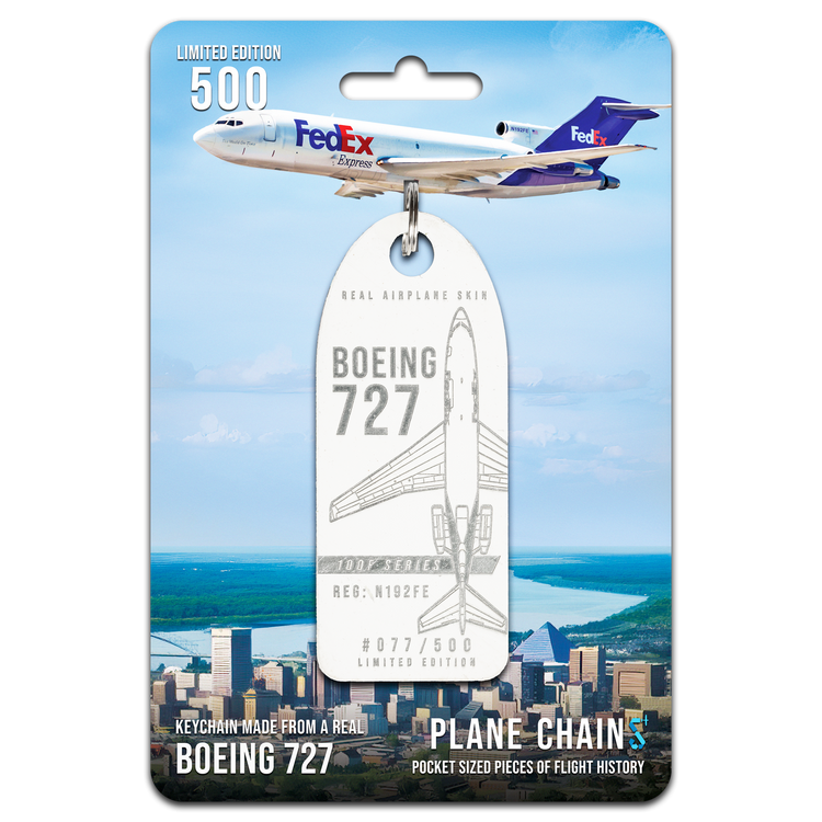 Introducing the newest addition to the Plane Chains fleet: the legendary Boeing 727-100 Freighter — FedEx N192FE. Crafted from the original fuselage skin of N192FE, this aircraft is a true icon of the early jet age. Delivered in 1966, it first flew passengers for United Airlines before being converted into a freighter and beginning a new life with FedEx Express. For decades, this tri-jet became a backbone of FedEx’s night-time cargo network, running routes through Memphis, Indianapolis, Newark, and hubs across North America.